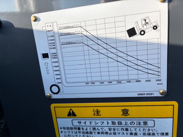 | 仕様・備考 | ディーゼル20t マスト3000mm フォーク2440mm 前輪エアーダブルタイヤ 後輪エアータイヤ サイドシフト付きフォークシフト 5連バルブ グッドビューア キャビン エアコン ノブずれ補正ステアリング 前部作業灯(ハロゲン) 簡易荷重計 規制緩和表示 車検装備 重量証明書 排ガス検査証 ★注★レンタル出庫中の場合がありますので事前のご連絡をお願いいたします。 01250126 |