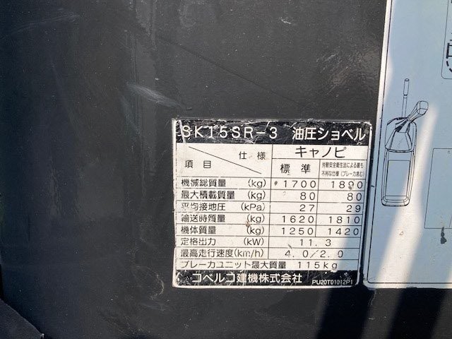 | 商品名 | ミニショベル | メーカー | コベルコ | 機種 | SK15SR-3 |