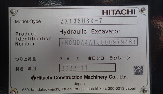 商品名 油圧ショベル メーカー 日立 機種 ZX135USK-7 号機 97946 YR 2022 HR 1133 (2026年4月) KM --- ランク B 置き場 津山本社 第2ヤード 保証 --- -