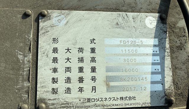商品名 フォークリフト メーカー 三菱ロジスネクスト(UC) 機種 FD120-5 号機 145 YR 2017 HR 9146 (2026年3月) KM --- ランク --- 置き場 津山本社 保証 --- -