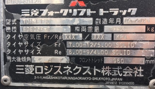 商品名 フォークリフト メーカー 三菱ロジスネクスト(三菱) 機種 FDE25P-T 号機 80128 YR 2024 HR 121 (2025年11月) KM --- ランク A 置き場 岡山支店 保証 --- -