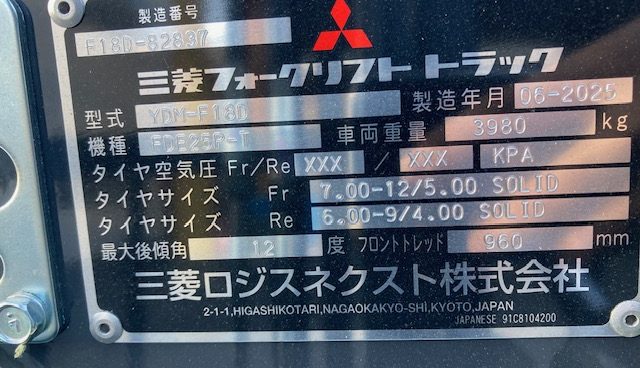 商品名 フォークリフト メーカー 三菱ロジスネクスト(三菱) 機種 FDE25P-T 号機 82837 YR 2025 HR 187 (2026年1月) KM --- ランク A 置き場 岡山支店 保証 --- -