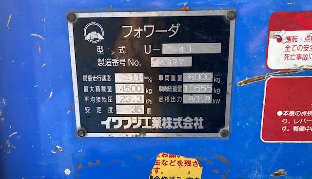 商品名 フォワーダー メーカー イワフジ 機種 U-4D 号機 2027 YR 2018 HR 4167 (2026年1月) KM --- ランク --- 置き場 津山本社 第2ヤード 保証 --- -